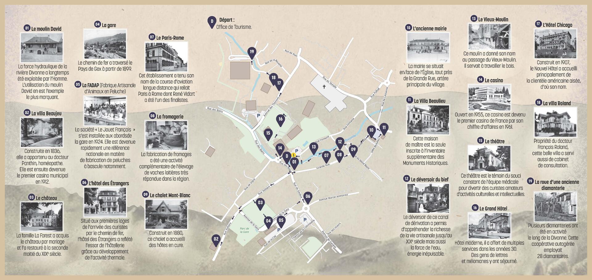 Ce parcours est le fruit d’une collaboration entre le service culturel et les associations patrimoniales. Ainsi, en partant de la place de l’Office de tourisme, en longeant la Divonne ou dans les petites ruelles, vous pourrez sentir l’âme de Divonne-les-Bains et les lieux qui ont fait son histoire et sa réputation.