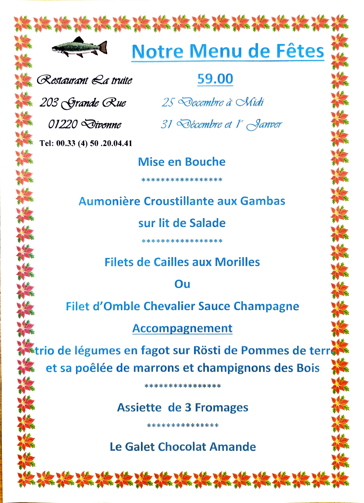 Le restaurant de La Truite vous propose un repas de Noël le jeudi 25 décembre à midi.