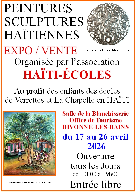 Les bénéfices de cette exposition aideront à la scolarisation des enfants défavorisés des écoles de Verrette et La Chapelle en HaÏti que l'association Haïti-Ecoles soutient.